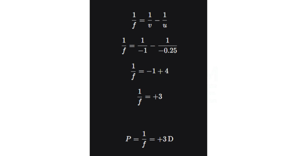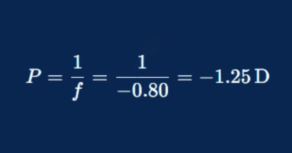 - দূৰদৃষ্টিগ্ৰস্ত চকুৰ নিকটবিন্দু, v=−1 m (চকুৰ পৰা ১ মিটাৰ দূৰত, ঋণাত্মক চিহ্ন চকুৰ সন্মুখত বুলি)